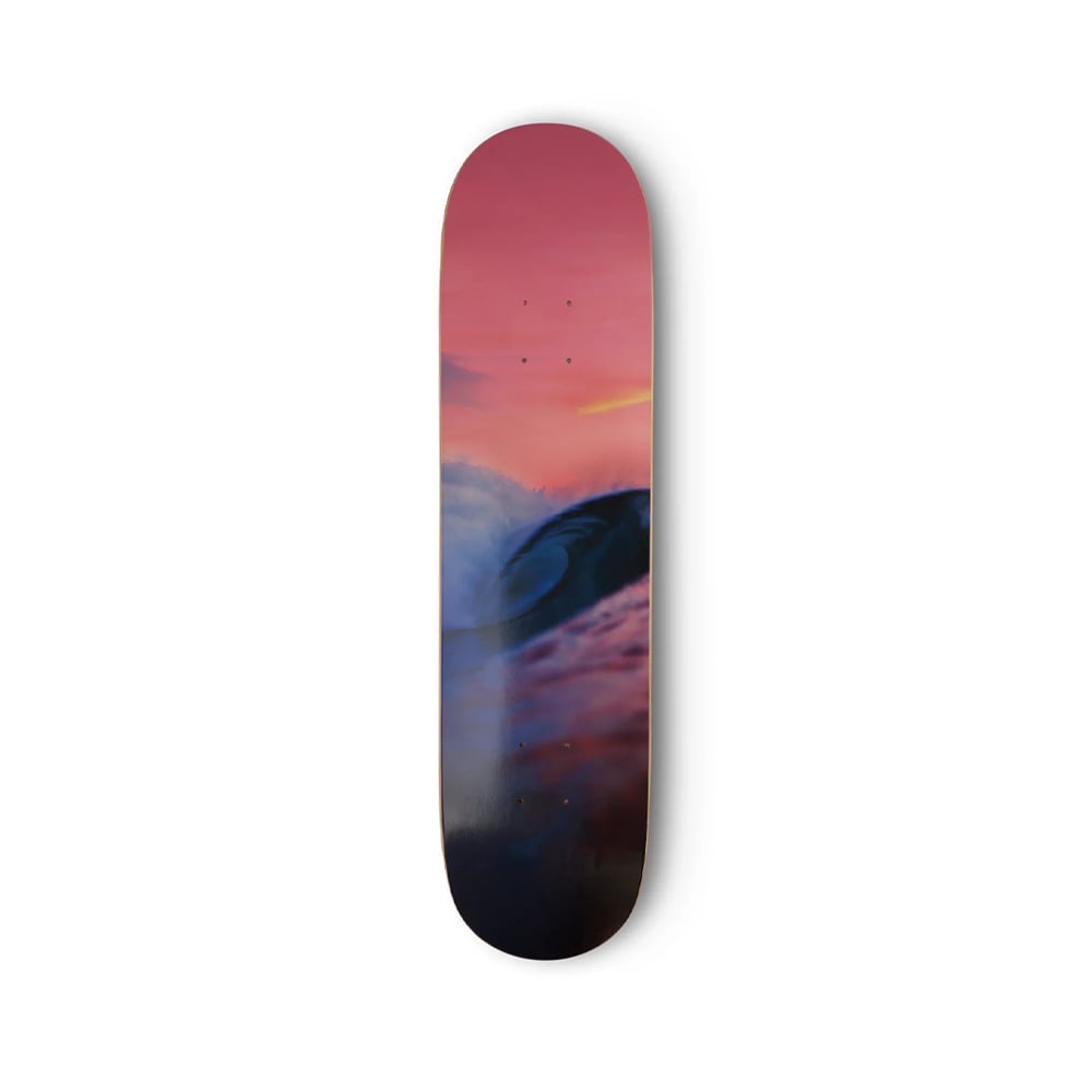Pink Serenity was inspired by a sunset over the waves of Hossegor, France, when the ocean softened under a glowing pink sky. This single skateboard deck captures that fleeting horizon and transforms it into a permanent work of art, blending movement and tranquility in one piece.